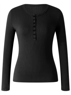Womens Spring Autumn Slim Tops Black Long Sleeve Button Down T-shirt