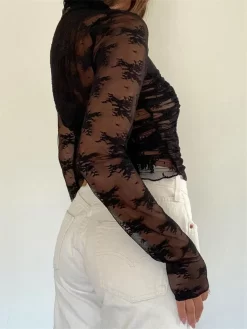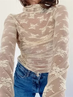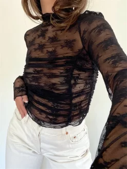 Women Long Sleeve T-Shirts Mesh Sheer Lace Ruched Mock Neck Shirts Summer Casual Slim Fit Tops Streetwear